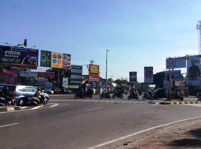 Jumat malam (11/09/2015), Kompasianer R.Gaper Fadli mengirim foto tentang "hutan reklame" yang terpampang di jalan strategis Kota Jogja. Saya tertarik ingin mengulas masalah reklame besar yang sudah penuh sesak sejak dua tahun terakhir di beberapa ruas jalan seperti perempatan Ring Road Utara-Condongcatur. Jika diamati, puluhan reklame raksasa ini berada dalam radius 2-3 kilometer dari kampus-kampus negeri di Kecamatan Depok. Sebut saja di pertigaan Gejayan dan UNY, terdapat lima papan reklame besar lebar 4-5 meter dan tinggi 2 meter, kini malah mirip dinding rumah yang menuntupi pemandangan disekitarnya.