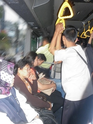 Suasana berdesak-desakan di dalam bus Trans Jogja